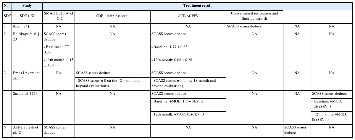 A comprehensive description of the variables related to treatment effectiveness is available in Tables 4 and 5. All five studies reported measurable decreases in dentin hypersensitivity following SDF application. However, the magnitude and duration of improvement varied by intervention type and study design.