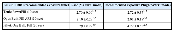 Fracture toughness data were analyzed for homoscedasticity with Levene test and normality with the Shapiro-Wilks test. Data were analyzed by two-way analysis of variance (ANOVA; factors: ‘type of bulk-fill RBC’ and ‘exposure mode’) and Bonferroni test (α = 0.05). The SAS software ver. 9.4 (SAS Institute Inc, Cary, NC, USA) was used for all the statistical analyses.
