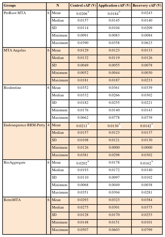 The data were analyzed using SPSS version 21.0 (IBM Corp., Armonk, NY, USA). Repeated-measures 2-way analysis of variance was used for intra-material comparisons of cAPs versus time. The post hoc Tukey test was used for pairwise comparisons. The level of significance was set at p < 0.05.