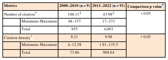 Metrics 2000–2010 (n = 9) 2011–2022 (n = 91) Comparison p value*