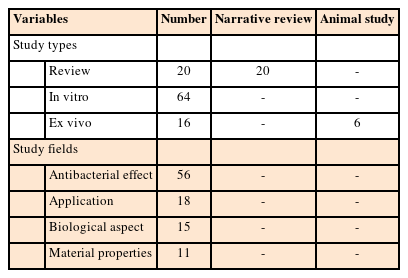 The majority of the publications were designed as in vitro (n = 64), followed by review (narrative = 20) and ex vivo (n = 16). Four different fields of study, highlighting the main idea of the selected articles, were defined by all investigators. “Antibacterial effect” was the most investigated area with 56 publications. “Application” (n = 18), “biological aspect” (n = 15), and “material properties” (n = 11) were the other study fields (Table 3).
