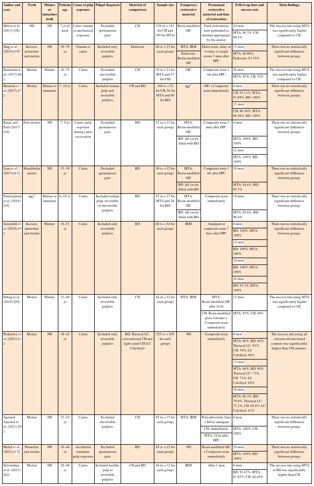 Hilton et al. (2013) [38] ND ND 7 yr or more Caries, trauma or mechanical exposure Excluded spontaneous pain CH 336 (n = 181 for CH and 195 for MTA) Resin-modified GIC Final restorations were performed as deemed appropriate by the dentist 24 mon The success rate using MTA was significantly higher compared to CH.