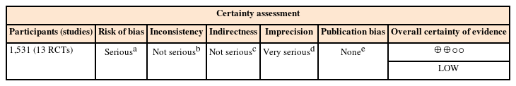 1,531 (13 RCTs)Seriousa Not seriousb Not seriousc Very seriousd Nonee ⊕⊕○○