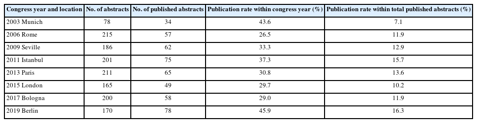 A total of 1,426 abstracts were presented at eight ConsEuro meetings held between 2003 and 2019. As of August 1, 2024, 502 abstracts were published in peer-reviewed journals. Twenty-four abstracts were excluded because they were published prior to the congress date, resulting in 478 published abstracts and an overall publication rate of 33.5%. The number and percentage of abstracts published by congress year are shown in