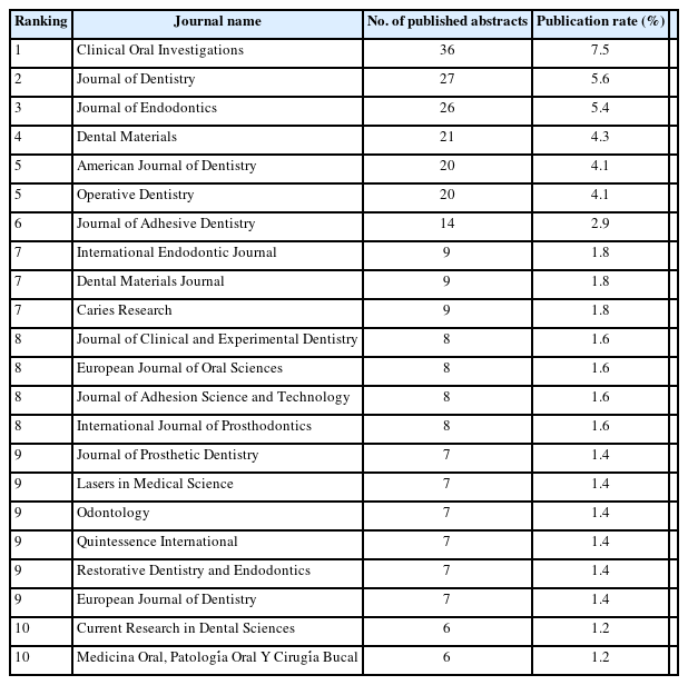 Two restorative dentistry specialists (ECY and ATEA) independently conducted the research. For each abstract, the title, subspecialty, study design, number of authors, and the country of the principal investigator’s institution were recorded in Excel (Microsoft, Redmond, WA, USA). Study designs were classified into one of the following categories: basic research, clinical research, animal research, case report/series, review, and technical note. Subspecialties were categorized as bleaching, caries, dental materials, dental education, endodontics, laser therapy, operative dentistry, and preventive dentistry. In cases of uncertainty, the two researchers resolved discrepancies through consensus.