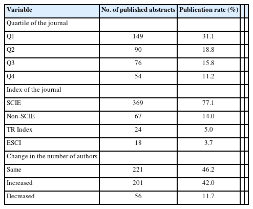 For abstracts confirmed as published, the following data were recorded: time to publication, the journal of publication, the journal’s impact factor (JIF) and quartile at the year of publication, index status, Scientific Journal Ranking (SJR) at the year of publication, and changes in the number of authors after publication [