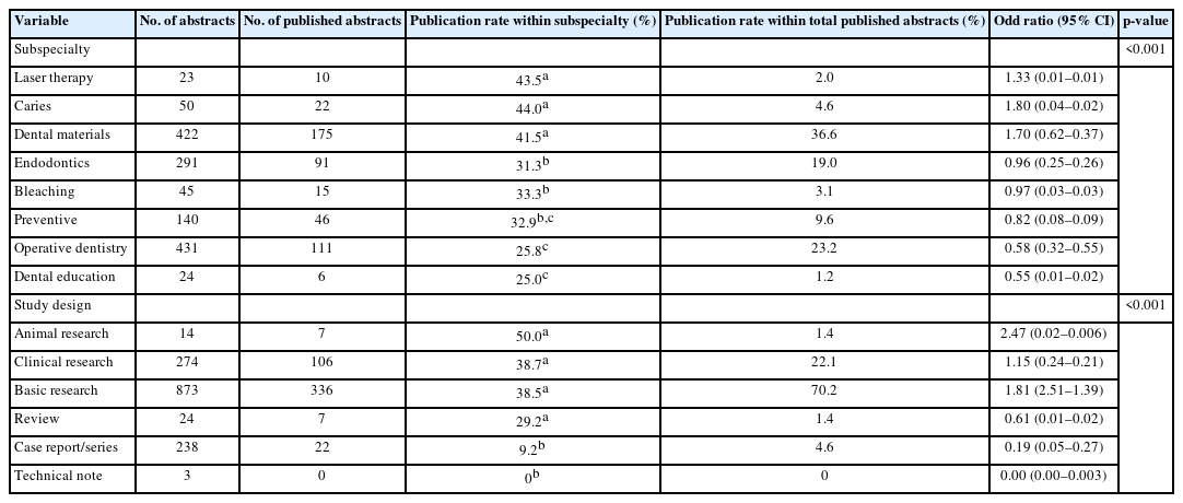 Table 5. Abstracts related to laser therapy (43.5%), caries (44.0%), and dental materials (41.4%) had significantly higher publication rates compared to those in operative dentistry (25.7%) and dental education (25.0%) (
