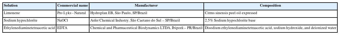 Table 1). The LE was diluted in distilled water to achieve the tested concentration (5%). For this, 0.5 mL of limonene was added to 95 mL of distilled water. Subsequently, 2.5 mL of the solution was used for the final irrigation of the root canal. A fresh limonene solution was prepared for each use. The irrigation process involved continuous flushing of the root canal with the solution for 5 minutes after instrumentation was completed. Canal drying was accomplished using a Capillary Tip aspiration cannula (Ultradent Products Inc.) and 35.06 absorbent paper points (Dentsply Maillefer).