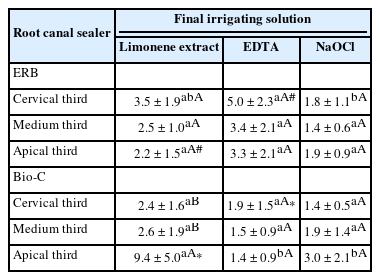 The parametric three-way analysis of variance (ANOVA) was used to analyze the influence and interaction among final irrigating solutions (NaOCl, EDTA, and LE), root canal sealers (ERB and Bio-C), and root thirds (cervical, middle, and apical). The Tukey post-hoc test was used for multiple comparisons with a significance level of p < 0.05.