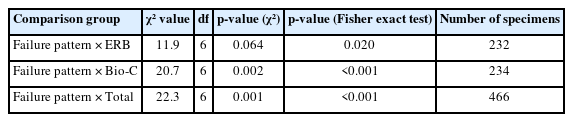 Table 4.Result of the Fisher exact test analysis of fracture pattern prevalence in relation to root canal sealers and final irrigating solution factors