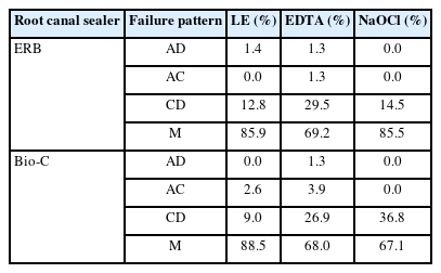 Table 5.Failure rate following the push-out bond strength test for different root canal sealers and dentin irrigating solutions