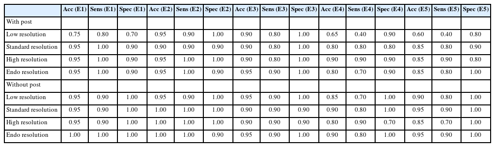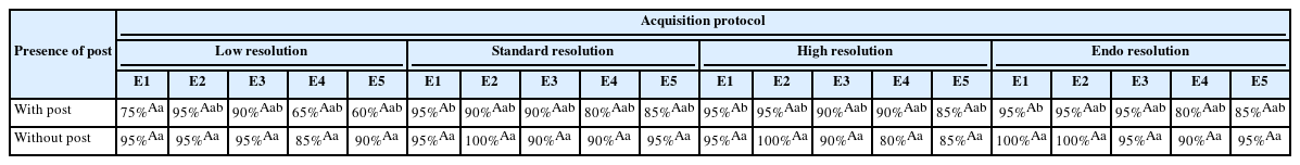 Table 1.Values of accuracy, sensitivity, and specificity for each examiner according to acquisition protocol and presence of metallic post