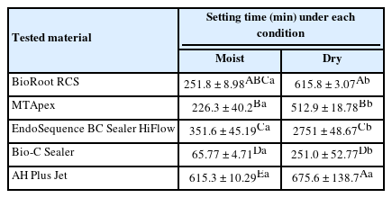 Table 3 shows the mean and standard deviation values for the setting times for materials’ setting time in moist and dry methods. Regardless of the method of analysis, EndoSequence BC Sealer HiFlow had the highest average setting time among the evaluated calcium silicate-based materials (