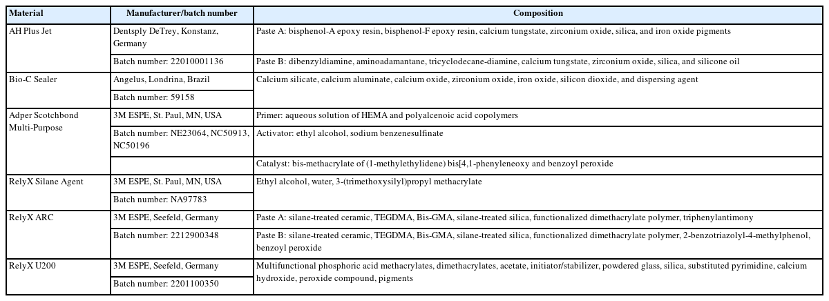 - 13. Rosa RA, Barreto MS, Moraes Rdo A, Broch J, Bier CA, Só MV, et al. Influence of endodontic sealer composition and time of fiber post cementation on sealer adhesiveness to bovine root dentin. Braz Dent J 2013;24:241-246.ArticlePubMed