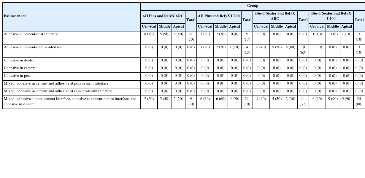 Table 3 shows the distribution of failure patterns, with mixed failure being the most common type, occurring in about 55% of specimens. This included adhesive failures at both the cement/post and cement/dentin interfaces, as well as cohesive failures within the cement. Adhesive failures accounted for nearly 45% of the cases, with 23.5% occurring at the cement/post interface and 21.5% at the cement/dentin interface.