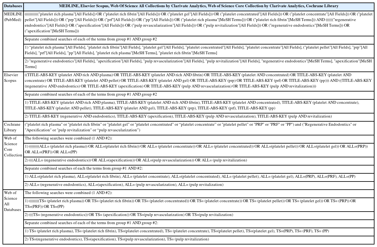 An extensive literature search was conducted across multiple electronic databases, including the Web of Science by Clarivate Analytics (All Collections and Core Collection), the Cochrane Library, MEDLINE PubMed, and Elsevier Scopus. A combination of Medical Subject Headings (MeSH) terms was employed to identify randomized controlled trials (RCTs) investigating the use of PRP, PRF, or PP in REPs for immature necrotic teeth. The search encompassed all available records from inception through May 2, 2025. A manual search was also conducted by screening the reference lists of all included studies and relevant systematic reviews and meta-analyses. The search strategy for each database is presented in