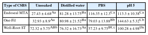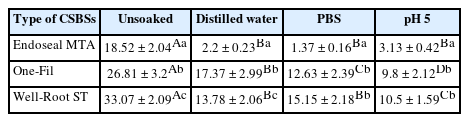 Table 2.Sealers tested under four conditions (unsoaked, distilled Water, PBS, pH 5) with 12 samples per condition
