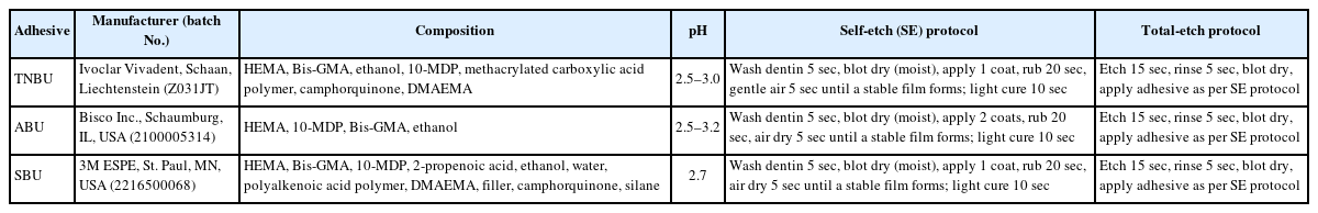 Table 1.Universal adhesives tested in the study, with their respective manufacturers, batch number information, composition, pH, and application mode