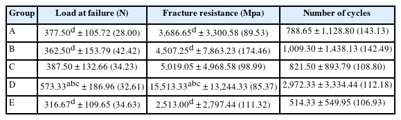 Mean load values per cycle also varied significantly among groups (H(4) = 20.332, p < 0.05). Group D (573.33 ± 186.96 N) had significantly higher load capacity compared with Groups A (377.5 ± 105.72 N, p < 0.05), B (362.5 ± 153.79 N, p < 0.05), and E (316.67 ± 109.65 N, p < 0.05). No significant differences were found between Groups A, B, and C.