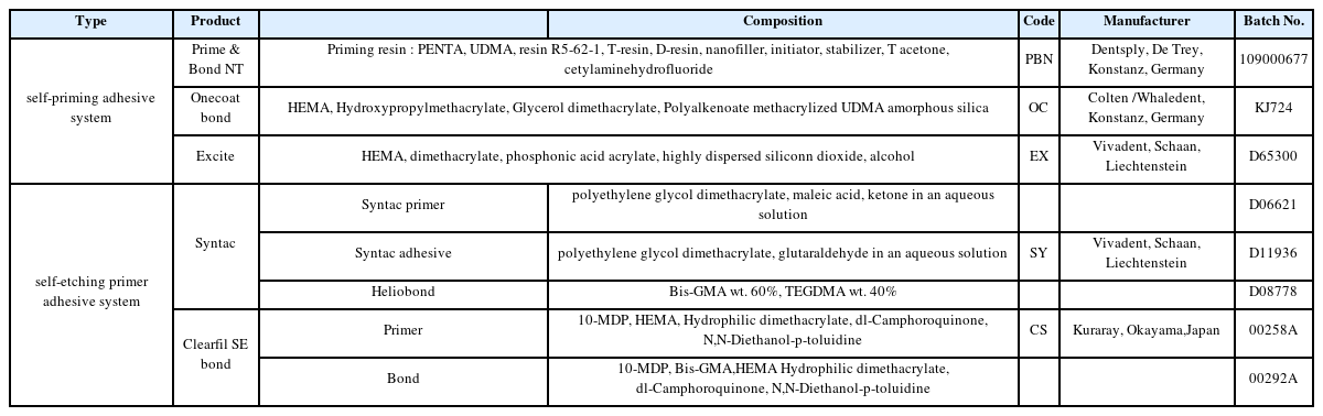 | Clearfil SE bond | Primer | 10-MDP, HEMA, Hydrophilic dimethacrylate, dl-Camphoroquinone, N,N-Diethanol-p-toluidine | CS | Kuraray, Okayama,Japan | 00258A | |
