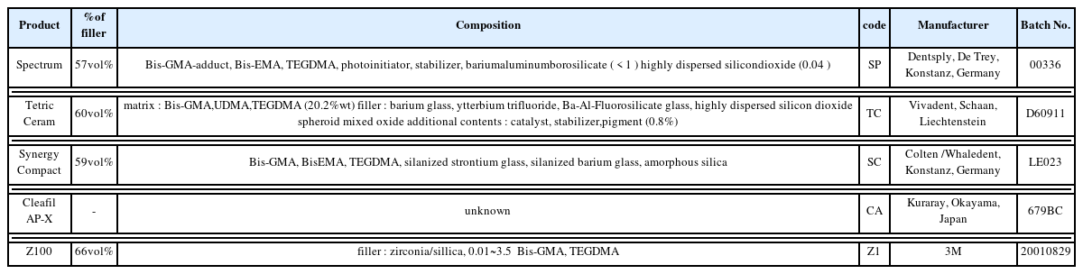 | Spectrum | 57vol% | Bis-GMA-adduct, Bis-EMA, TEGDMA, photoinitiator, stabilizer, bariumaluminumborosilicate ( < 1㎛) highly dispersed silicondioxide (0.04㎛) | SP | Dentsply, De Trey, Konstanz, Germany | 00336 |