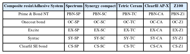 | Composite resin\Adhesive System | Spectrum | Synergy compact | Tetric Ceram | Clearfil AP-X | Z100 |
