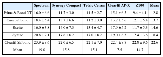 | Clearfil SE bond | 23.9 ± 8.6 | 22.0 ± 6.5 | 22.1 ± 7.0 | 22.4 ± 8.8 | 22.8 ± 9.6 | 22.6 |
