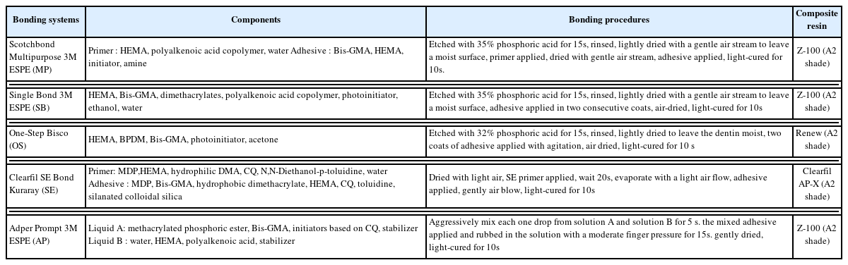 | Scotchbond Multipurpose 3M ESPE (MP) | Primer : HEMA, polyalkenoic acid copolymer, water Adhesive : Bis-GMA, HEMA, initiator, amine | Etched with 35% phosphoric acid for 15s, rinsed, lightly dried with a gentle air stream to leave a moist surface, primer applied, dried with gentle air stream, adhesive applied, light-cured for 10s. | Z-100 (A2 shade) |