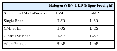 | Clearfil SE Bond Kuraray (SE) | Primer: MDP,HEMA, hydrophilic DMA, CQ, N,N-Diethanol-p-toluidine, water Adhesive : MDP, Bis-GMA, hydrophobic dimethacrylate, HEMA, CQ, toluidine, silanated colloidal silica | Dried with light air, SE primer applied, wait 20s, evaporate with a light air flow, adhesive applied, gently air blow, light-cured for 10s | Clearfil AP-X (A2 shade) |