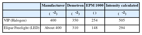 | Manufacturer | Demetron | EPM 1000 | Intensity calculated | |