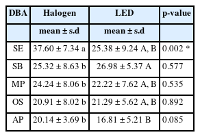 | Halogen (VIP) | LED (Elipar Freelight) | |