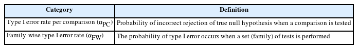 The set of comparisons is referred as a 'family of test'. The multiple comparison procedure that tests a set of hypotheses at the same time is also called a 'simultaneous test'. The most important issue in multiple comparisons is the control of type I error. Type I error is defined as the probability of committing error that a true null hypothesis is rejected. We call the type I error as α error. An α error level of 0.05 is frequently used for assessing a hypothesis. The overall error level for the family of tests is different from the α error level for a comparison (