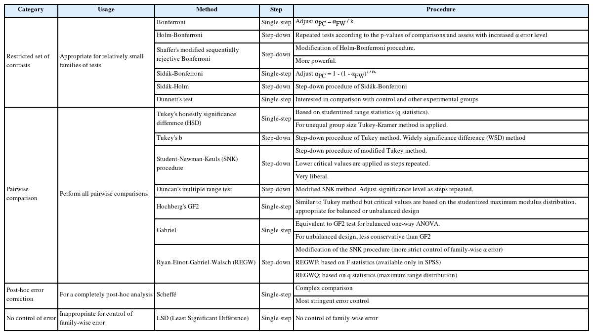 FW within an acceptable level of 0.05. The methods can be categorized into three types according to the size and nature of family of tests, such as restricted sets of contrasts, pairwise comparisons, and