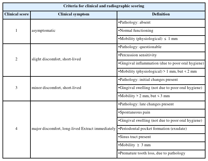 Figure 1. The teeth were evaluated clinically and radiographically by two observers independently who were blinded to the treatment type. Clinical and radiographic criteria for assessing teeth were explained along with a calibration process to the two observers on three initial cases. The criteria, based on Zurn and Seale has been used for scoring the clinical and radiographical findings as presented in