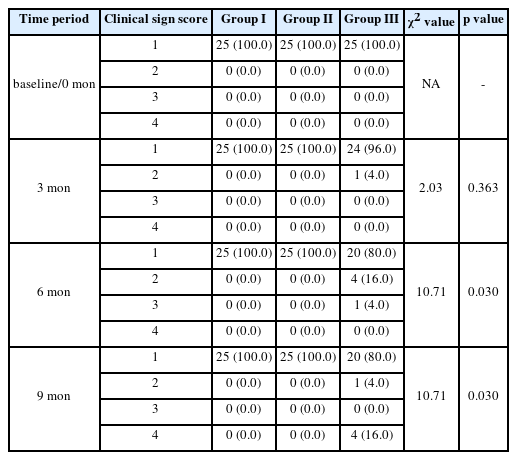 p = 0.030). Further, at 9 months, one case (4.0%) had clinical sign score 2 and four cases (16.0%) had clinical sign score 4 in Group III, and the frequency of these were also significantly higher as compared to 0.0% of both Group I and Group II (χ