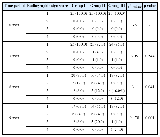 The mean (± SD) age in Groups I, II, and III were 6.48 ± 1.73 years, 6.92 ± 1.78 years, and 7.00 ± 1.63 years, respectively. They were not different statistically. Further, in all three groups, the frequency (%) of females was higher than males except Group II. Comparing the sex proportions (Male/Female) of three groups, χ2 test revealed similar sex proportions among the groups (χ2 = 0.75; p = 0.686), which were not different statistically. The interobserver reliability/variability of clinical and radiographical signs over the periods (baseline 0, 3, 6, and 9 months) was analyzed by using Kappa-Cohen test (κ value) and was found 100.0% (κ = 1.00) at all periods.