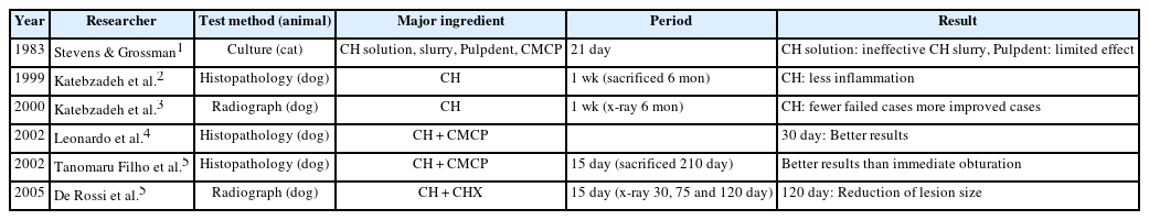Katebzadeh et al. histologically and radiographically compared the periapical healing of the infected roots obturated in one-step or with prior Ca(OH)2 disinfection.2,3 The result showed that 1 week Ca(OH)2 disinfection before obturation results in significantly less periapical inflammation. Leonardo et al. performed histopathological evaluation of the repair of periapical tissues of dog's teeth with induced chronic periapical lesions after dressing with Ca(OH)2 at different time periods.4 The animals were sacrificed at 7, 15 and 30 days and the teeth specimens were examined with a light microscope. They concluded that more advanced repair was seen at 30 days compared to the other two periods. Tanomaru Filho et al. compared the periapical lesions of the dog teeth received immediate canal filling or 15 days Ca(OH)2 dressing.5 There was better histological repair in the groups with the Ca(OH)2 dressing than the groups with immediate obturation. This small number of animal studies were the only ones that gave histopathological evidences.