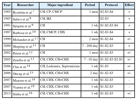 2005Zerella et al.13CH, CHX, CH+CHX7 - 10 dayS1-S2-S3-S2-S3+/-