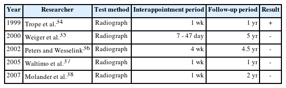 • 3. Katebzadeh N, Sigurdsson A, Trope M. Radiographic evaluation of periapical healing after obturation of infected root canals: an in vivo study. Int Endod J 2000;33:60-66.ArticlePubMed