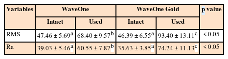 Table 1 Means and standard deviations of root mean square (RMS) and average roughness (Ra) of intact and used WaveOne and WaveOne Gold files