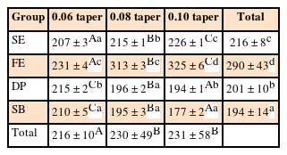 The temperature of SE and FE was lowest with the 0.06 taper pluggers and increased significantly as the plugger taper increased. In contrast, the temperature of DP and SB was the lowest with the 0.10 taper pluggers and increased significantly as the plugger taper decreased. Among the pluggers with the same taper, significant differences in the peak temperature were observed between the electric heat carriers. Only 5 of the 12 pluggers showed temperature differences of less than 10°C from the set temperature of 200°C (