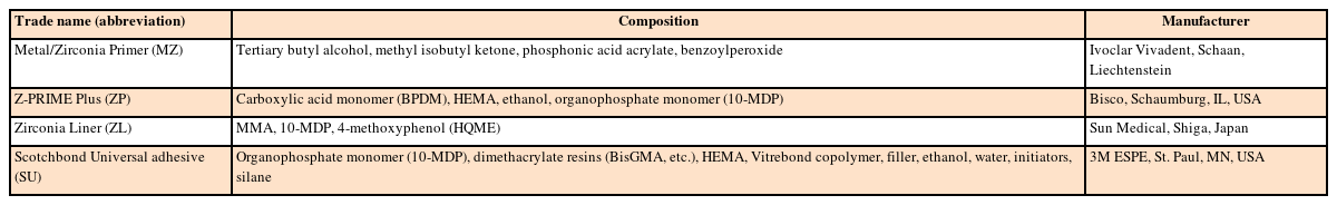 Three different zirconia primers were applied on the zirconia surface. Metal/Zirconia primer (MZ; Ivoclar Vivadent, Schaan, Liechtenstein), Z-PRIME Plus (ZP; Bisco, Schaumburg, IL, USA), and Zirconia Liner (ZL; Sun Medical, Shiga, Japan) were applied to the specimens of the MZ, ZP, and ZL groups, respectively according to the manufacturer's instructions. Then, Transbond XT Primer was applied on both surfaces and brackets were bonded using Transbond XT.