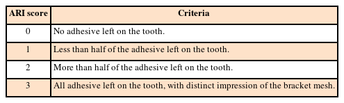 Adhesive remnant index (ARI) scores calculated depending on the remnants of adhesive on the zirconia surface after debonding