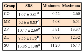 The results of shear bond strength analysis are described in Table 3. Surface treatments with primers resulted in shear bond strength higher than that obtained without primer use in the CO group. The SU group showed the highest shear bond strength, followed by the ZP, ZL, MZ, and CO groups.
