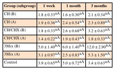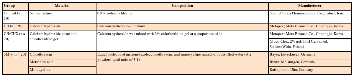 Table 1. In the control group, the canals were filled with saline and a cotton pellet was placed in the pulp chamber. Each experimental group was randomly divided into 2 subgroups of 10 (A and B). In subgroup A, we tried our best to apply the medicaments only to the root canals (below the cementoenamel junction), and a small cotton pellet was placed in the pulp chamber. In subgroup B, the canals were completely filled with the materials, and a cotton pellet was dipped in the medicaments and placed in the pulp chamber. The access cavity in all specimens was then restored with Cavit (3M ESPE, Seefeld, Germany). During the experiment, the teeth were in an upright position to prevent the flow of the medicaments in the root canal system towards the coronal portion of the teeth. All the teeth were kept in a dark glass jar, completely covered with a piece of cotton, and stored in an incubator at 37°C and 100% humidity.
