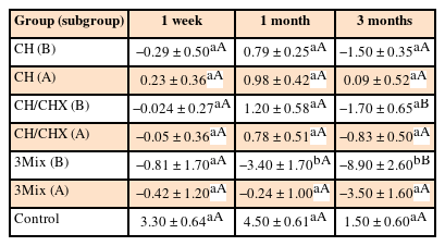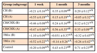 The greatest color change (ΔE) was observed at 3 months (p < 0.0001) and in 3Mix subgroup B (p = 0.0057). No significant color change occurred in the CH (p = 0.7865) or CH/CHX (p = 0.1367) groups over time, but the 3Mix group showed a significant ΔE (p = 0.0164).