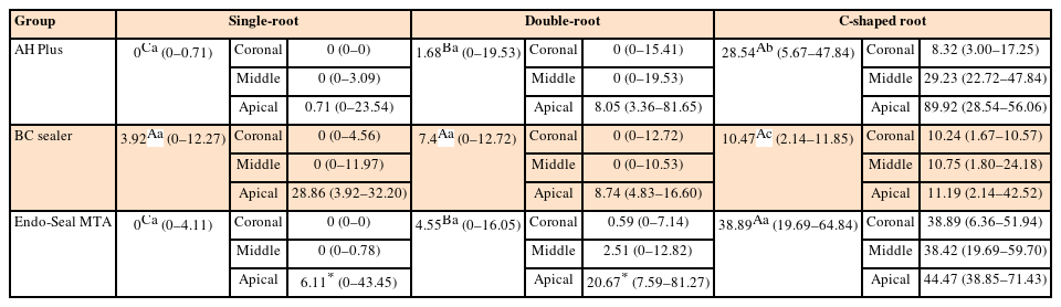 Table 1. Overall, there were no significant differences in the percentage of remaining filling material between the tested sealers in single- and double-rooted teeth. However, EndoSeal MTA showed the highest values, followed by AH Plus and BC sealer, in C-shaped roots (