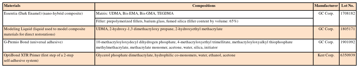 - 21. Patel J, Granger C, Parker S, Patel M. The effect of instrument lubricant on the diametral tensile strength and water uptake of posterior composite restorative material. J Dent 2017;56:33-38.ArticlePubMed