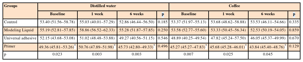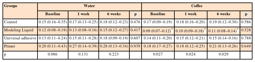 Storage time did not influence the VHN of the nano-hybrid composite in any group (p > 0.05). OptiBond XTR Primer application affected the VHN negatively in all investigated storage medium and time conditions (p < 0.05). Modeling Liquid application yielded improved Ra values for the specimens stored in coffee at each time point (p < 0.05). Modeling Liquid application was associated with the lowest ΔE values in all investigated storage medium and time conditions (p < 0.05).