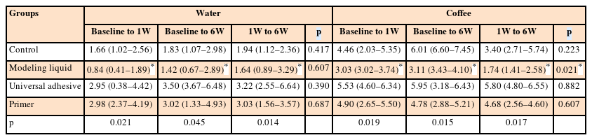 11]. Thus, one of the purposes of the present study was to investigate whether the color shade of a nano-hybrid composite prepared with a modeling agent would change after 6 weeks of storage in distilled water or coffee. In the overall analysis, the ΔE* of the nano-hybrid composite depended on the type of modeling agent used. Only ΔE* values in the Modeling Liquid group remained stable over time regardless of storage medium; by contrast, the control, universal adhesive and primer of the self-adhesive system groups showed increased ΔE* values after 6 weeks of storage in water and coffee compared with the baseline values. These findings demonstrate that the type of modeling agent used for layering plays an important role in the color stability of the composite.